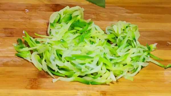 再取适量的萝卜洗净擦成细丝后,也下锅焯一下水,焯水2分钟后捞出过凉水,并沥干水分剁细备用。