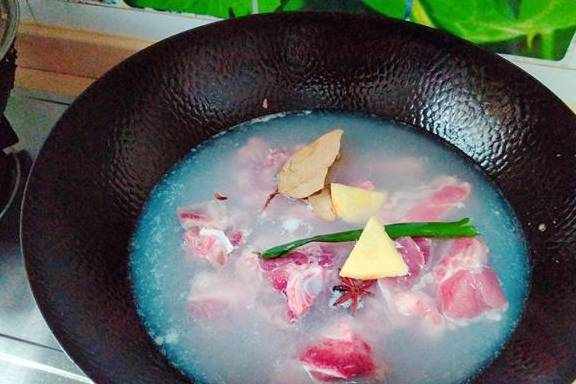 将猪脊骨冷水下锅加香叶,八角,葱,姜,料酒。去腥。大火把水烧开去除血沫。