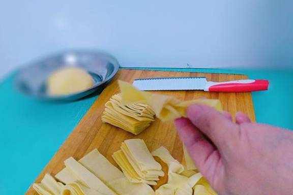 把干豆腐(千张)切成1.5厘米宽3寸长的长条,然后再用干豆腐(千张)条打成结,备用。