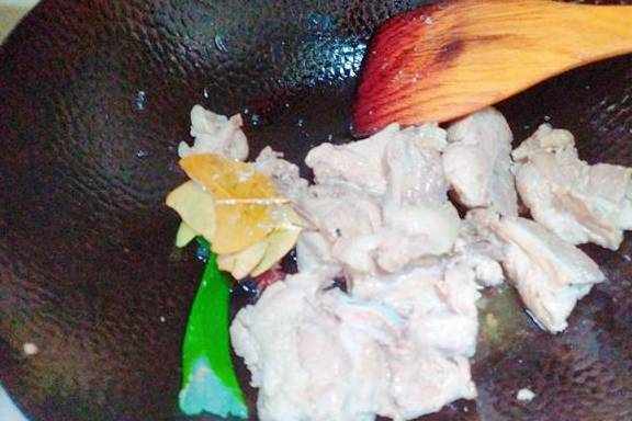 将焯好的猪脊骨冲去血沫备用。锅中放少许油加入适量的葱,姜,八角,香叶,翻炒出香味下入准备好的猪脊骨和冰糖继续翻炒上色。最后加入清水,酱油,老抽,大火烧开,转入砂锅炖煮。