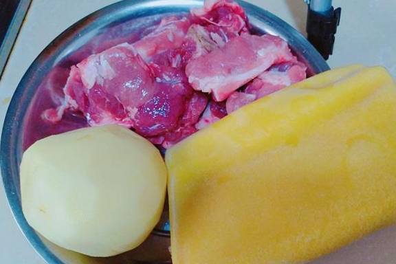 待猪脊骨用筷子可以戳透时,加入掰好的大土豆块继续炖煮至土豆块软烂。然后加入鸡精调味,盛出。