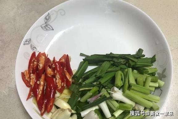 第一步:首先准备一个青红椒切成滚刀片,在准备三颗大蒜拍扁切成小段,一片生姜几个蒜子切成片备用。