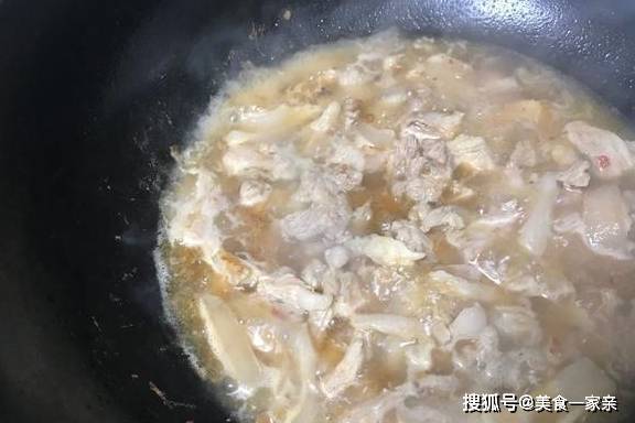 第四步:起锅烧油,锅中油温6成热时,下入腌好肉条炒至变色。