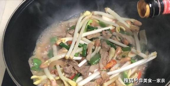 第五步:倒入青红椒,生姜、蒜子、再把花生芽发进去翻炒几下,加入一点盐,生抽,蚝油,再加入少许鸡精,再稍微洒一点清水,快速翻炒几下即可出锅装盘。