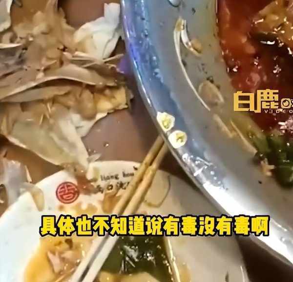视频显示,在火锅残渣中几片绿叶非常显眼。火锅店老板称自己在收拾卫生的时候,发现锅里有几个不明绿色物体,因为自家火锅店没有这种大叶菜,所以非常疑惑。
