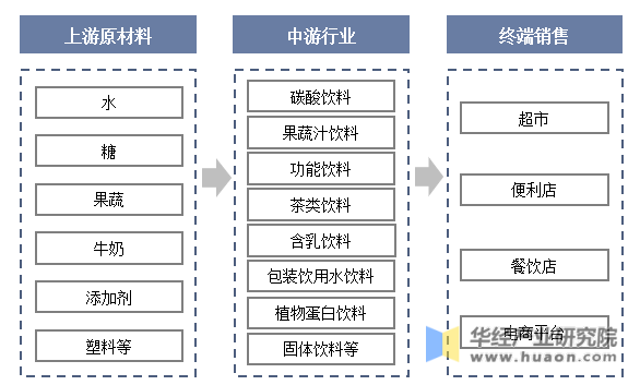 饮料行业产业链上游包括水、糖、牛奶、果蔬、添加剂、塑料等原材料,产业链中游环节为饮料制造商,下游销售终端分为线上电商平台渠道和线下超市、便利店、餐饮店销售渠道等。