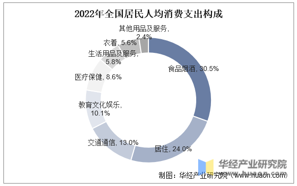 近年来,随着国民经济的不断发展,人民收入水平和生活消费需求不断提高,食品饮料的消费支出持续增加。据国家统计局数据,2022年,全国居民人均消费支出达到24538元,比2021年名义增长1.8%,扣除价格因素影响,实际下降0.2%。2022年居民人均消费支出类别占比中,食品烟酒占比超三成。