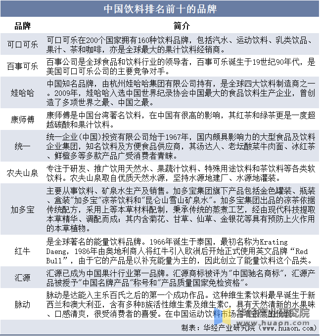 我国饮料行业生产企业众多,竞争激烈,市场集中度分散。目前,我们熟知的饮料品牌有可口可乐、百事可乐、娃哈哈、康师傅、农夫山泉等。