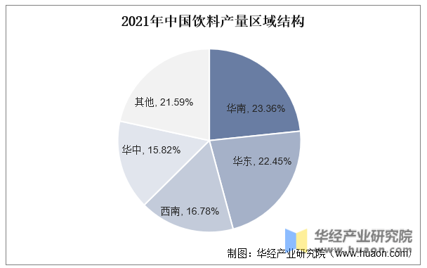 从区域分布上看,我国饮料行业产量分布较为集中,2021年,华南地区、华东地区、西南地区、华中地区的产量占比分别为23.36%、22.45%、16.78%、15.82%。
