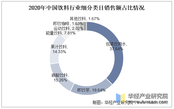 从细分市场的销售来看,包装引用水、即饮茶、碳酸饮料和果汁饮料是饮料行业的重要细分赛道,2020年的销售额占比分别为37.64%、19.64%、15.26%、14.33%,其他品类的饮料占比均在10%以下。