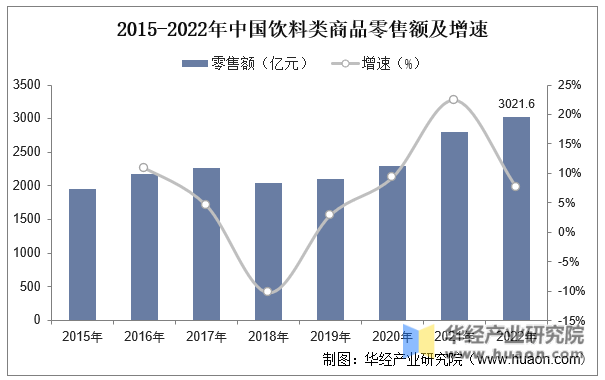 饮料消费已成为当下快消品行业里的主力军,随着社会群体的喜好的改变、消费群体的不断扩大,可选择的饮料种类将越来越多。我国饮料类商品零售额呈现出波动增长趋势,2022年,中国饮料类累计零售额达到3021.6亿元,2015至2022年期间年均复合增长率为6.37%。