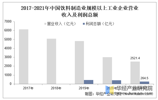 从企业的经营情况上看,2021年上半年,全国饮料制造业规模以上工业企业营业收入为2521.4亿元,利润总额为264.5亿元。