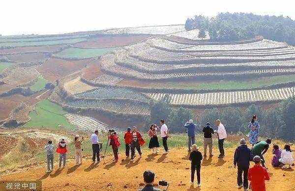 △3月4日,昆明,许多游客在东川红土地景区春游赏景。