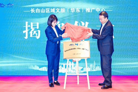 图为长白山管委会副主任李南哲与白山市副市长吴倩共同为“长白山区域文旅(华东)推广中心”揭牌