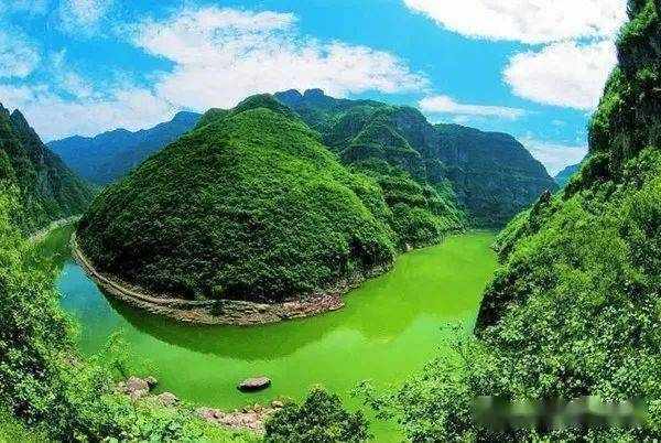 太行山另一大绝景就是曲流之峡,考察途中,当我们身临曲峡其境时,有一种突然发现的兴奋,以及叹为观止的惊异。一般情况下,江河的曲流主要发育在下游地势平坦的冲积平原上;在一些岩质较松软的丘陵地区也有完美的曲流形成,如四川盆地中嘉陵江水系流经的红色丘陵;在黄河沿岸的晋陕黄土高原,人们也发现了嵌入在黄土层及其下伏基岩中的深切河曲。总的来说,这些曲流所在的河谷还是比较宽阔平坦的。但当你在太行山主脉中,发现深切在“白色石灰岩”中的幽深峡谷,竟然也出现九曲回肠、百折千绕的曲流时,就不能不感叹天下曲流竟能达到如此奇异和极致的境地!