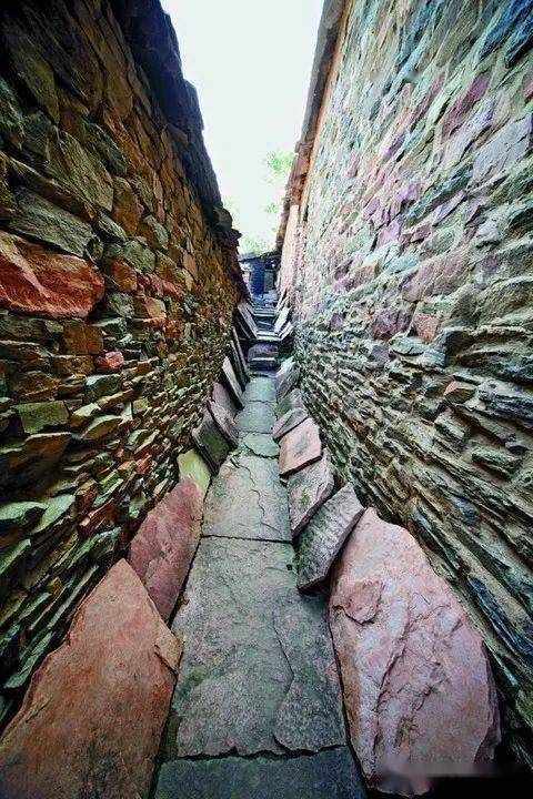 在太行山中,经常可以看到被用做建筑石料或者铺路的岩石,使用最多的是“红色嶂石岩”,即一种变质的红色石英砂岩。这种岩石坚硬、层薄,容易劈开成较平整的岩板,这种岩石在层面上还大量保留有波浪状起伏的远古波痕,成为一种标志,也具有装饰的美感,照片中亦可以看到。摄影/杨越峦