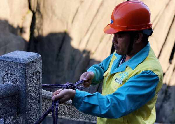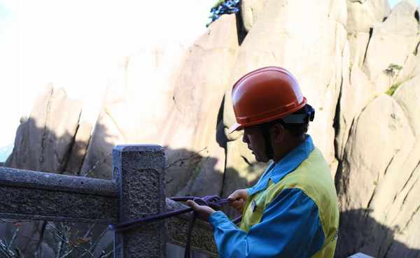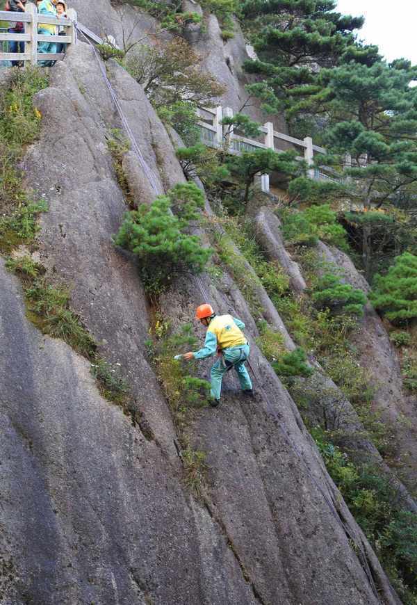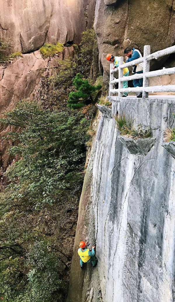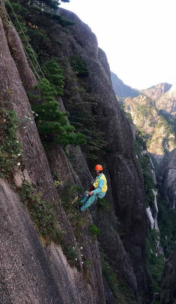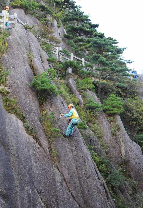 在去往迎客松景点的一处新开发的游步道上,年近五旬的李培生正在和同事一起仔细检查身上的放绳装备。几分钟后他将在90度的垂直悬崖上进行国庆当天的最后一次高空工作。