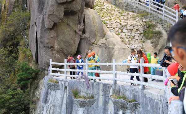 很多中外游客看到放绳工的危险工作,无不对他们的敬业精神心生敬意,称他们是悬崖上的“美容师”,觉得他们是黄山一道独特的“风景”。