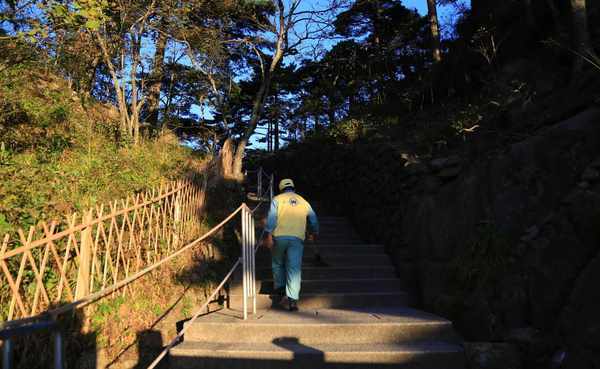 像李培生这样的放绳工,黄山景区有近20人,分布在各个片区,专门负责放绳索到悬崖谷底捡拾游客扔掉的垃圾。李培生负责的主要是玉屏景区如玉屏峰、天都峰、莲花峰等景点,各景点间的距离加起来有7公里山路,这些景点都非常陡峭,悬崖几乎是垂直的峭壁。用于拾捡垃圾的绳子,每根有50 米长,是专业的户外登山绳索。一般的悬崖,一根绳索就够了,但有的地方必须2 根绳索连起来,才能下到近百米深的谷底。