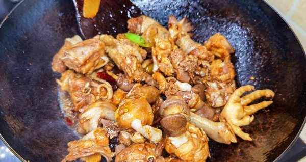 第四步:炒五分钟至鸡肉上色,加入适量开水,水多加一勺盐,加入适量鸡精,大火煮熟,盖上锅盖,翻动中小火,煮2-3小时。普通的鸡肉可以炖一个小时,但是跑山鸡需要大火,所以一定要多加水,至少要炖2小时。