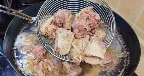 第二步:锅中加入适量的水,将鸡肉放入冷水中,然后用大火煮熟。水焯一分钟后,取出所有鸡肉并沥干水。
