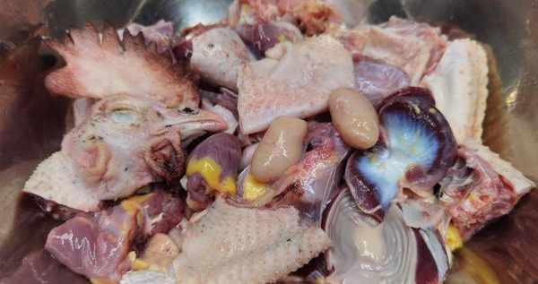 第一步:将跑山鸡身上剩余的羽毛全部清理干净,切掉鸡屁股,将跑山鸡对半切开,取出内脏,漂洗两遍,洗去血水,剁成小块,包好放入一个盆,加适量清水浸泡1小时,吸去血水。