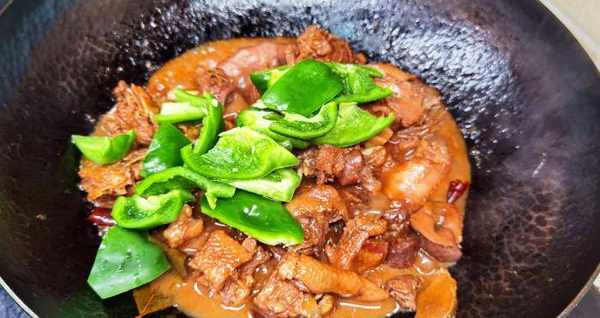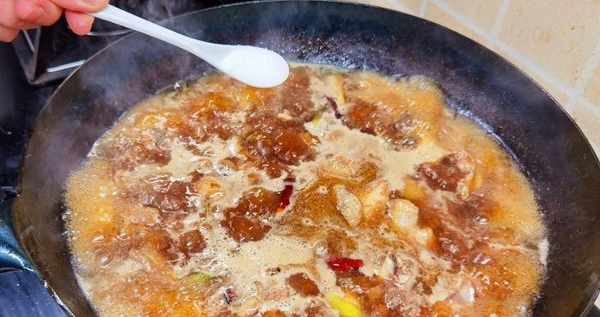 第五步:文火炖2小时后,锅里的汤已经煮的差不多干了。此时,我们打开锅盖,加入适量的辣椒块,用大火搅拌至辣椒碎,然后从锅中取出。