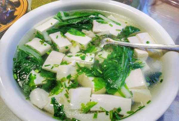 原料:青菜150克、豆腐100克、大葱2根、虾皮5克