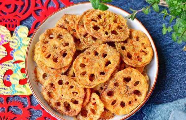 4、锅里放植物油烧热,每人放入一片藕片,炸至金黄色;