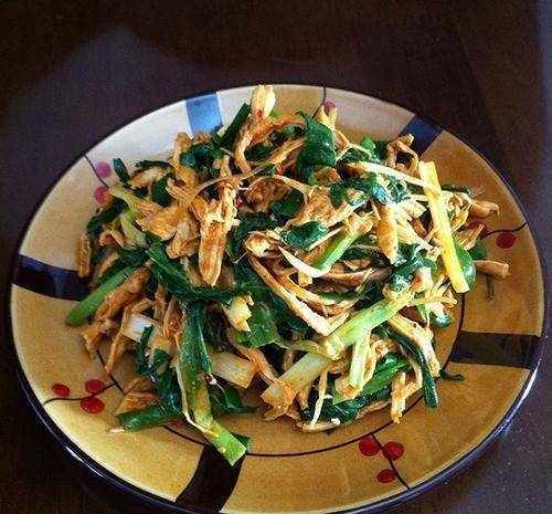 3.在平底锅中加热油。油热后放入切好的葱姜花椒炒香,然后放入韭菜快炒,加入盐2克,鸡粉2克,花椒粉1克,1克糖。炒好香料,加入切碎的鸡肉和5克料酒炒至韭菜破烂,撒上香油拌匀,装盘。
