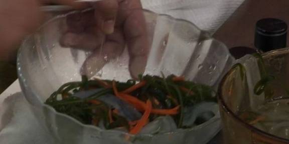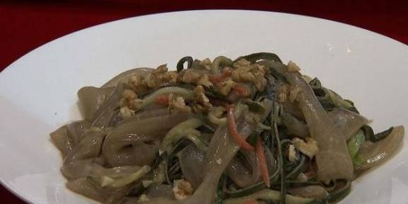 吃海带能够补铁补碘,还能补充膳食纤维。另外,海带里面含有海带多糖,是可以抑制肿瘤的。这道菜中还含有两种可以预防食道癌效果特别好的核桃和生菜。核桃中含有Ω-3脂肪酸,有助于抗癌。