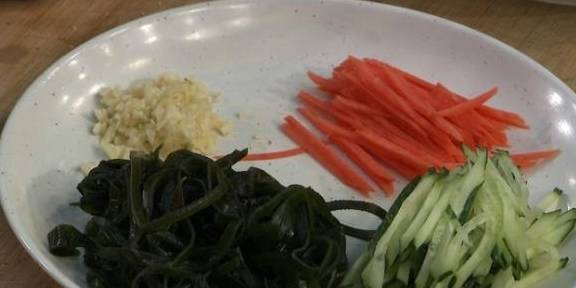 3、把胡萝卜、黄瓜和海带洗干净切成丝备用,把生菜叶洗干净撕成片。