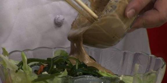 在这道美味大拉皮菜肴中会用到芝麻酱和海带等食材。芝麻酱里面含有维生素E,它能够起到抗氧化的作用,而且还含有脂肪,可以起到润滑作用。