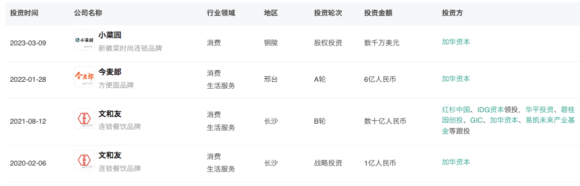 投资方加华资本在餐饮行业里也曾投资多家知名企业,比如2010年他们曾投资过休闲食品公司来伊份,2011年投资了坚果休闲食品公司洽洽食品。2015年投资了3家食品公司,分别是调味食品生产公司加加食品、功能饮料公司红牛饮料、中餐连锁品牌巴比食品。2017年他们投资了东鹏饮料,2018年投资了老乡鸡。2020年和2021年两次投资了连锁餐饮品牌文和友,2022年投资了方便面品牌今麦郎。