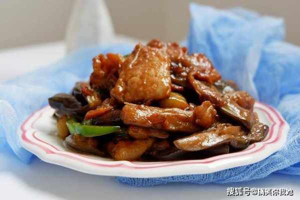 2、一直炒至双面金黄,肥肉部分炒出油,倒入茄子改中小火翻炒,让茄子吸收油分。
