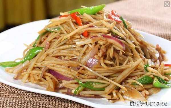 2、炒锅内加入适量的油,油热后,加入葱姜,炒出香味,加入肉丝,翻炒至熟。