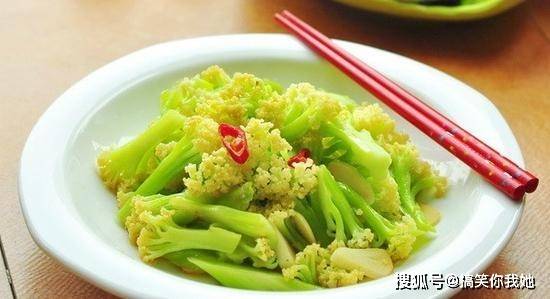 2、放菜花煸炒,加适量清水盖上盖炖一会儿稍微变软,加盐调味翻炒均匀出锅。