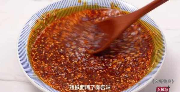 再倒剩下的热油,这样可以避免油温过高,辣椒面糊了有苦味。