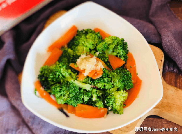 用厨房剪刀将西兰花剪成小朵,清洗两遍,再放进淡盐水里浸泡十分钟。胡萝卜去皮洗净,切成薄片。