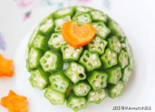 秋葵搓洗干净,开水入锅煮两分钟。煮好后晾凉,切成小块。