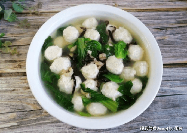 接着放入木耳、青菜、虾米,转中火,继续煮两分钟。最后加少许盐调味即可。