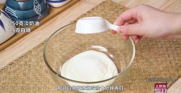 250g淡奶油先放冰箱冷冻十分钟,然后加上15g白糖打发。