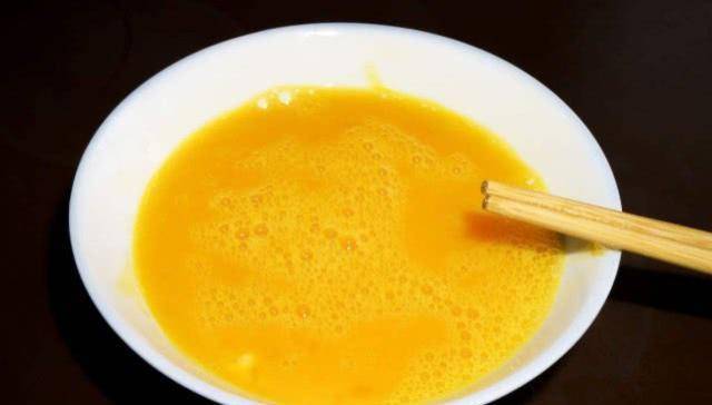 第三步:煮西红柿的过程当中拿两个鸡蛋打入小碗当中,用筷子快速的将鸡蛋液搅拌均匀之后将鸡蛋液慢慢的倒入到锅里面。