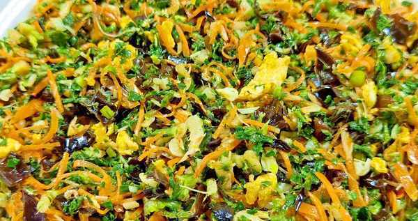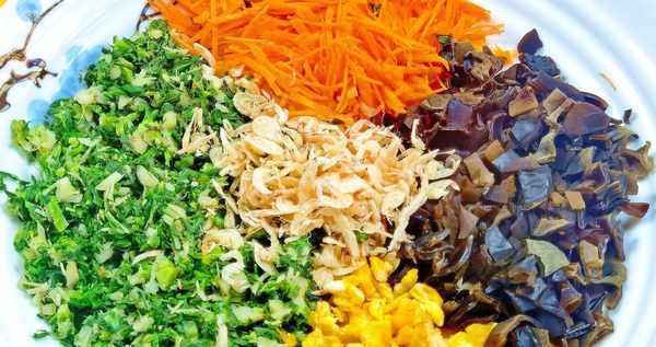 3、锅中油烧热,打入两个鸡蛋打入碗中,加盐,搅匀鸡蛋液,倒入锅中,用筷子快速打圈搅拌,将鸡蛋煎成块备用。香菇用温水泡软后,切成小块;将胡萝卜洗净、去皮并切成细条。将荠菜末、鸡蛋末、香菇末、胡萝卜末和虾皮放入锅中,加入一勺淀粉、盐、香油、极鲜食用油,拌匀做馅。