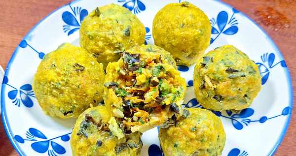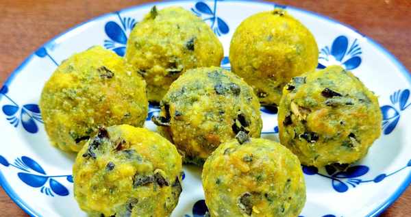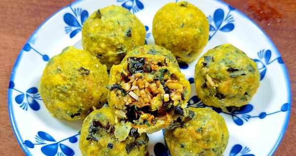 4.取适量的馅,反复捣烂几次,成团后,擀一层玉米面,再捣烂几下,再擀一层玉米面,重复3-4次后,菜饺子就做好了!