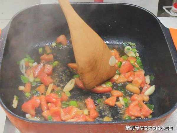 锅内烧油,放入葱姜爆香,再倒入番茄和虾仁炒出红汁,然后加入适量的清水、食盐、味精、白糖、鸡粉、十三香、生抽、老抽搅拌化开调料。
