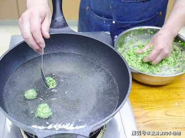 汤汁烧开以后,我们开始下青豆丸子,抓一把馅料在虎口处挤成丸子放入锅中,水不要过于沸腾,让丸子在锅中慢慢定型。下丸子的时候要经常摇晃锅以免糊底,全部下完以后转大火煮一会,丸子全部飘起来基本就熟了,淋上蛋液,撒上荆菜叶,美味即成。
