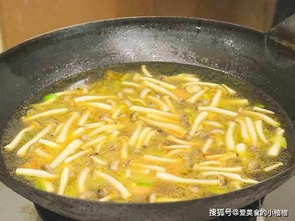 锅内烧油 放入葱姜爆香,倒入番茄大火翻炒出番茄汁水,再放入蟹味菇一起翻炒,倒入适量的清水、番茄酱、生抽、食盐、味精、白糖、鸡粉、胡椒粉、十三香搅拌均匀,大火把汤汁烧开,然后倒入山药用筷子搅匀,以免粘锅糊底。