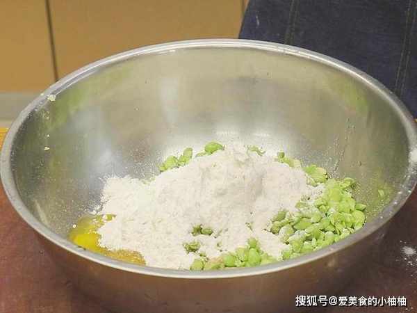 一个番茄切成小块;几个虾仁切成小粒;一把荆菜把叶片掐下来;一碗青豆用刀切碎放入盆中,加入两个鸡蛋、食盐、味精、十三香、少许胡椒粉、少许面粉、适量的清水,调成这样一抓一团的面糊。