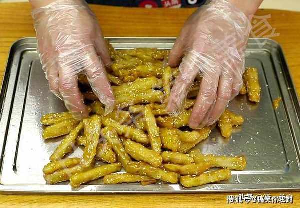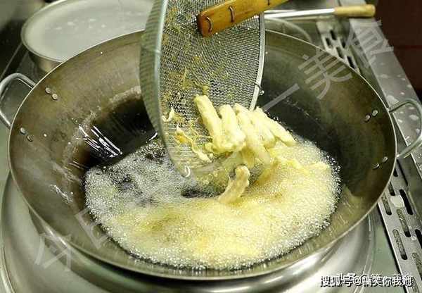 把油温升高至6成热,放入藕条快速复炸20秒钟立即捞出,这一步不仅能够去除多余的油脂,还能使藕条更加的酥脆。